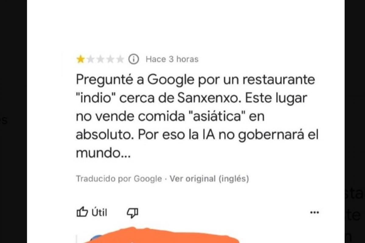 En su escrito, la usuaria cuenta su caso tras puntuar al restaurante con una estrella de cinco posibles: "Pregunté a Google por un restaurante 'indio' cerca de Sanxenxo. Este lugar no vende comida 'asiática' en absoluto. Por eso la IA no gobernará el mundo...".