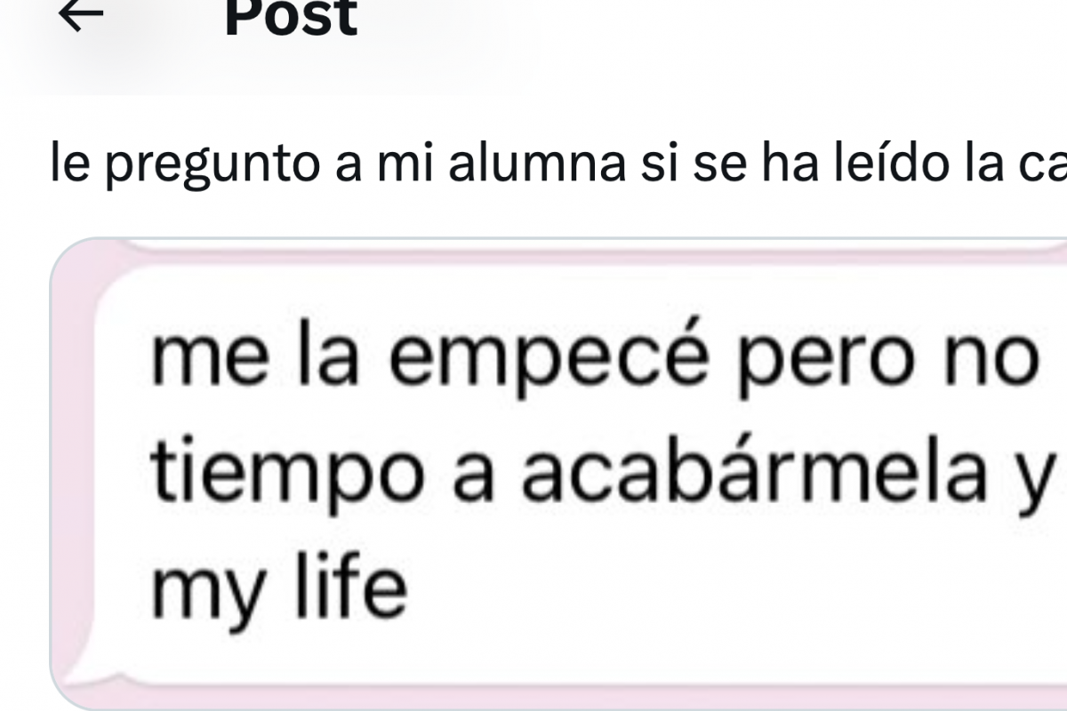 "Le pregunto a mi alumna si se ha leído la casa de bernarda alba", dice la docente en X, antes Twitter, en uno de esos mensajes que rápidamente se ha llenado de comentarios, de reacciones gloriosas y de experiencias propias.