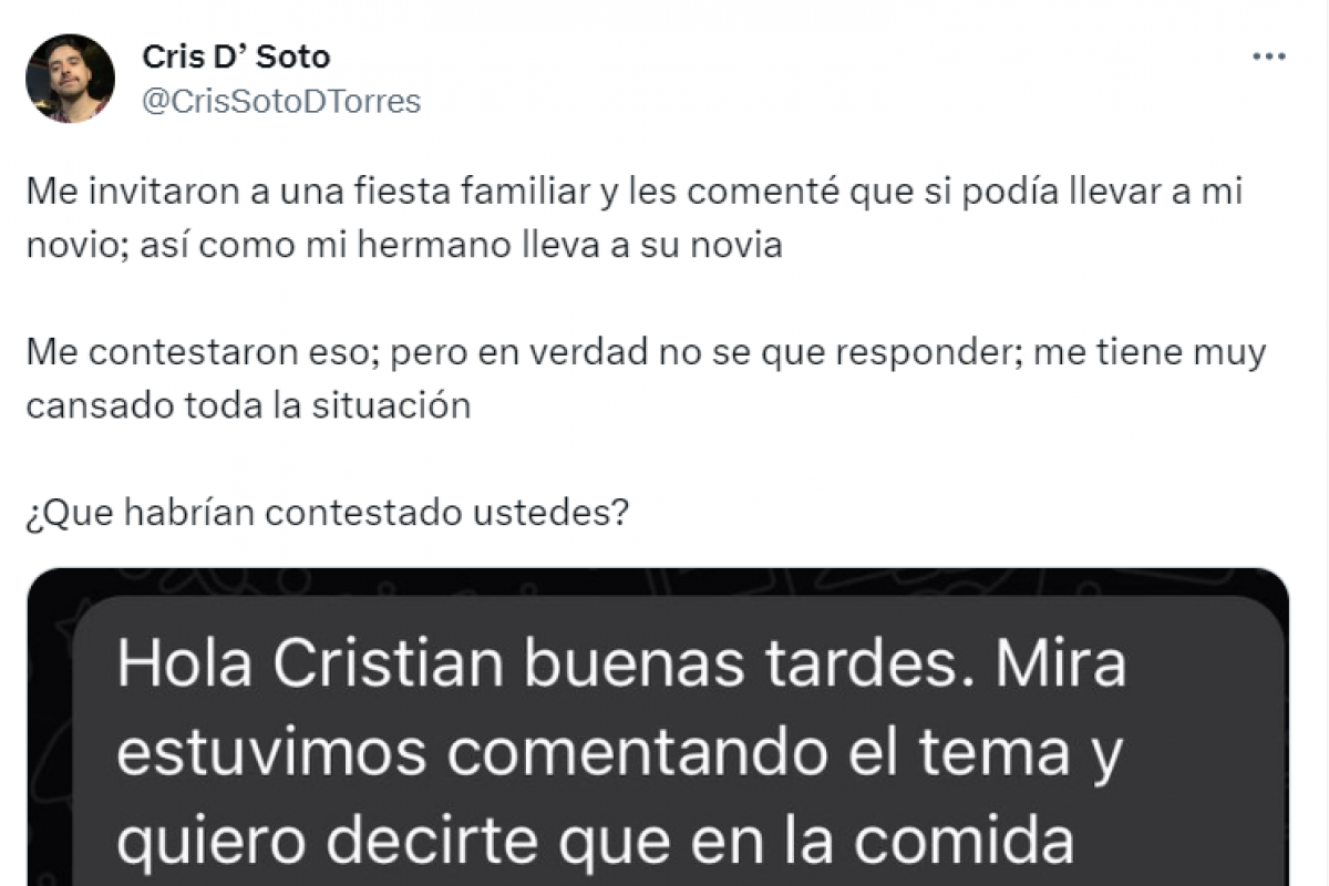 El usuario de Twitter @CrisSotoDTorres está provocando el pasmo general al compartir en esa red social la respuesta que le dio su familia cuando les preguntó si podía acudir a una cena con ellos junto a su novio.