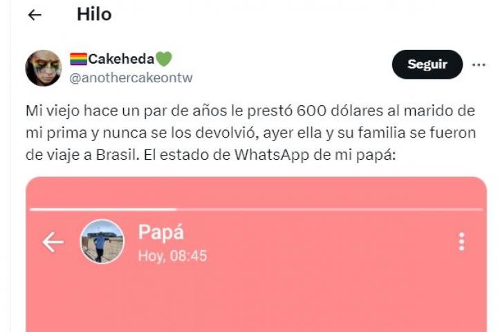 La usuaria de X @anothercakeontw ha mostrado un estado de WhatsApp publicado por su padre este domingo tras ver que unos familiares a los que les prestó dinero se han ido de vacaciones.