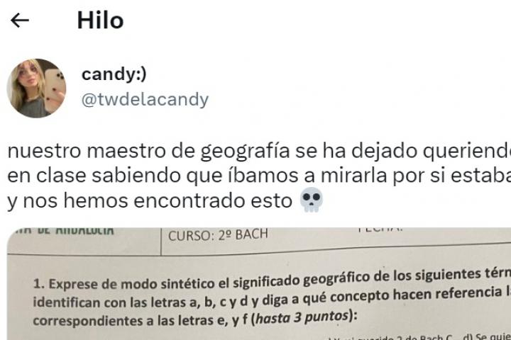 "Nuestro maestro de Geografía se ha dejado queriendo la carpeta en clase sabiendo que íbamos a mirarla por si estaba el examen y nos hemos encontrado esto", ha detallado, en un mensaje que arrasa en redes.