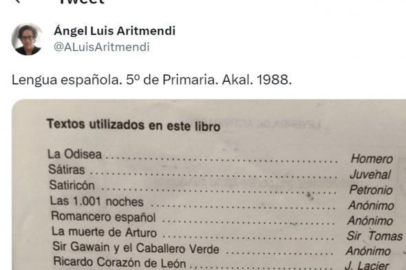"Lengua española. 5º de Primaria. Akal. 1988", ha escrito en redes sociales, junto a una imagen en la que mostraba los textos que se habían usado en el libro mencionado.