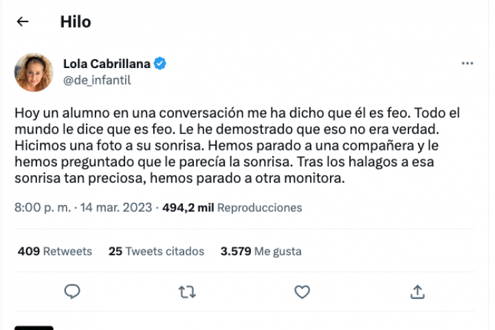 Lola Cabrillana, escritora y profesora de infantil, ha publicado un hilo de tuits que está conmoviendo a miles de personas en esa red social. En los mensajes, la maestra relata la lección que le dieron a un niño que decía de sí mismo que es feo.