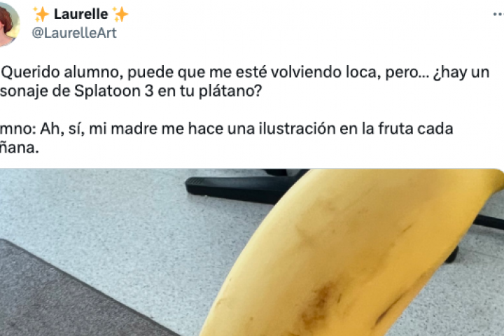 "Yo: 'Querido alumno, puede que me esté volviendo loca, pero… ¿hay un personaje de Splatoon 3 en tu plátano?'.
