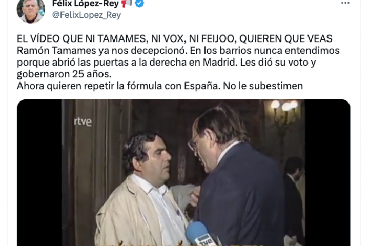 "EL VÍDEO QUE NI TAMAMES, NI VOX, NI FEIJOO, QUIEREN QUE VEAS Ramón Tamames ya nos decepcionó. En los barrios nunca entendimos porque abrió las puertas a la derecha en Madrid. Les dio su voto y gobernaron 25 años. Ahora quieren repetir la fórmula con España. No le subestimen", ha avisado López-Rey en Twitter.