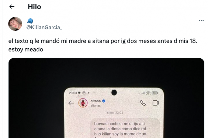 El usuario de Twitter @KilianGarcia_ ha conquistado a medio Twitter después de publicar en esa red social un mensaje que su madre le envió a la cantante Aitana por Instagram justo antes de que él cumpliese los 18 años.