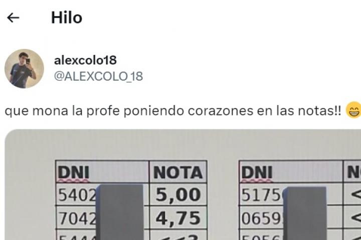 "Que mona la profe poniendo corazones en las notas!! 😁", ha bromeado el protagonista, en un mensaje que se ha hecho muy viral en redes sociales.
