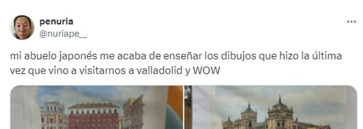 "Mi abuelo japonés me acaba de enseñar los dibujos que hizo la última vez que vino a visitarnos a Valladolid y WOW", ha publicado la tuitera justo antes de adjuntar las cuatro fotos de los dibujos.