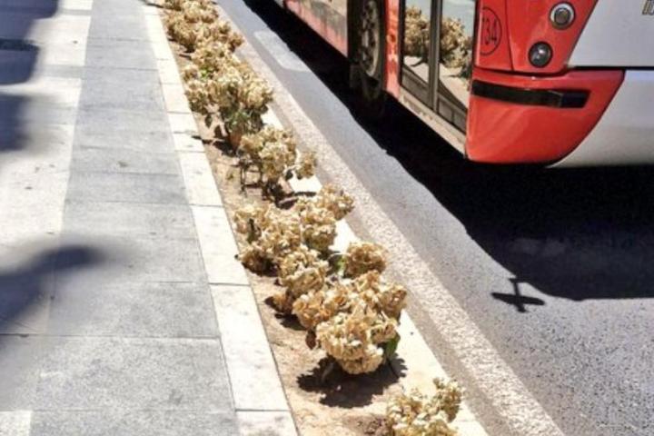 "Las flores secas en la Avenida Constitución... ¿No sería mejor plantar árboles o plantas arbustivas autóctonas que aguanten el calor?", ha escrito, acumulando cientos de 'me gusta'.