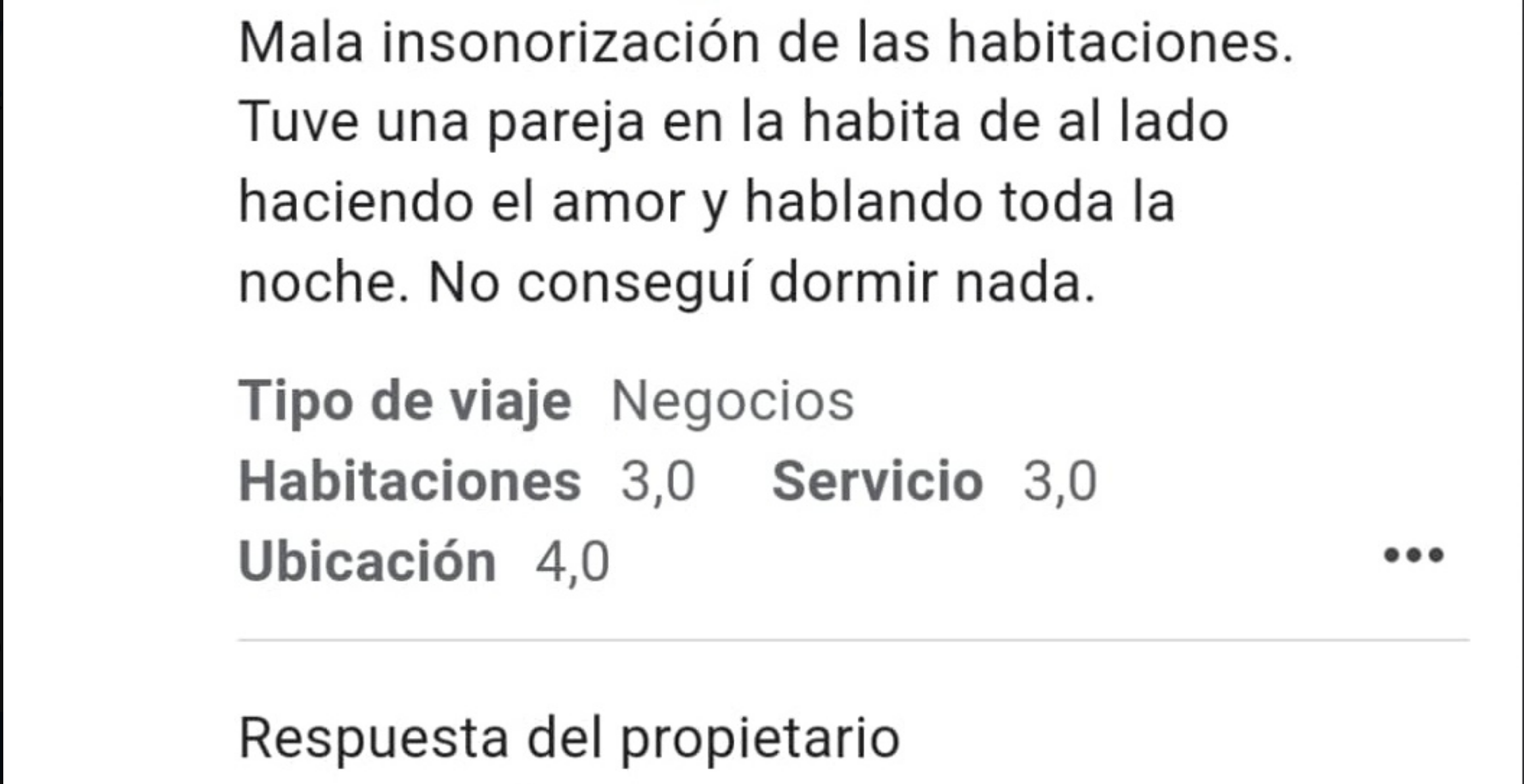 "Mala insonorización de las habitaciones. Tuve a una pareja en la habita de al lado haciendo el amor y hablando toda la noche. No conseguí dormir nada", ha lamentado el cliente de lo que parece un hotel.