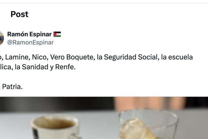 "Esto, Lamine, Nico, Vero Boquete, la Seguridad Social, la escuela pública, la Sanidad y Renfe. Una Patria", ha afirmado el tertuliano político junto a una foto con varios elementos.