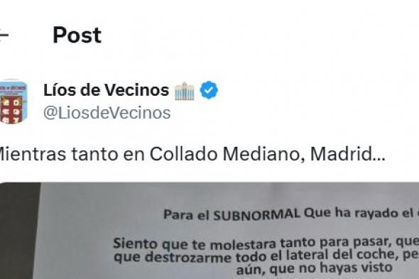 Como se puede ver en el letrero, que ha subido a X la popular cuenta @liosdevecinos, el propietario del automóvil de Collado Mediano, en Madrid, señala: "Para el subnormal que me ha rayado el coche: siento que te molestara tanto para pasar, que hayas tenido que destrozarme todo el lateral del coche".