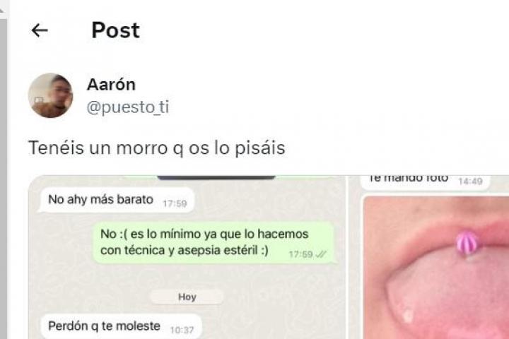 "Es lo mínimo, ya que lo hacemos con técnica y asepsia estéril", le dijo él. Días después, el cliente le volvió a escribir para consultar qué se podía echar en la lengua, ya que se había hecho un piercing y podría habérsele infectado.