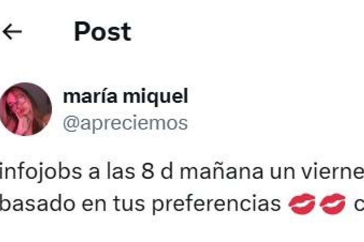 "InfoJobs, a las 8 de la mañana de un viernes: 'Hola a lo mejor te interesa esto basado en tus preferencias 💋💋 conductor de grúa", ha revelado la usuaria en un primer mensaje en la red social X.