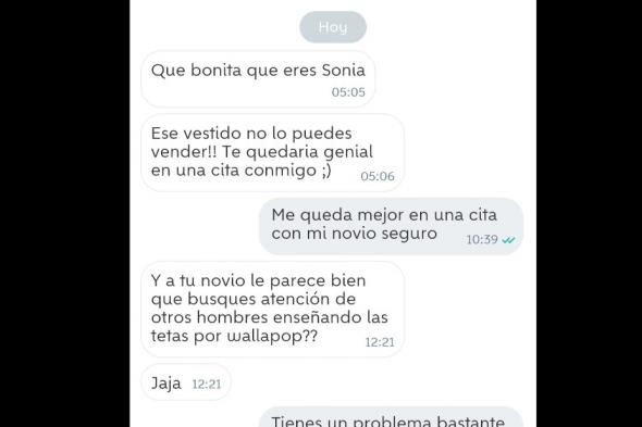 Pero el otro no paró ahí y respondió: "¿Y a tu novio le parece bien que busques la atención de otros hombres enseñando las tetas en WallaPop? jaja". A lo que ella respondió tajante: "Tienes un problema bastante serio si piensas que yo subo fotos de mi ropa para buscar la atención de neandertales como tú".