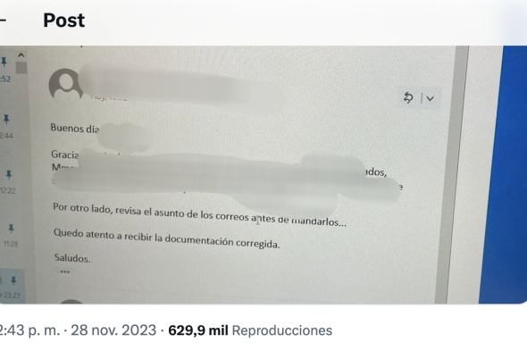 Ha compartido, además, un pantallazo con la respuesta que le han dado a la persona que ha puesto el "hola puta": "Revisa el asunto de los correos antes de mandarlos. Quedo atento a recibir la documentación corregida".