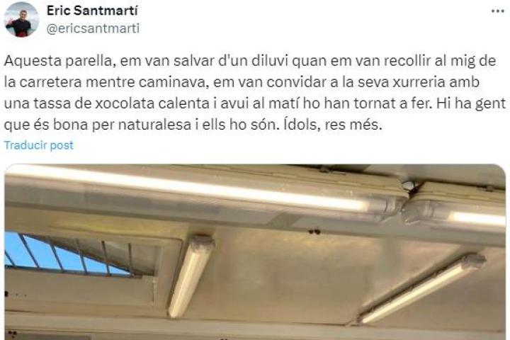 "Esta pareja me salvó de un diluvio cuando me recogieron en medio de la carretera mientras caminaba. Me invitaron a su churrería con una taza de chocolate caliente y hoy por la mañana han vuelto a hacerlo", ha relatado el tuitero.