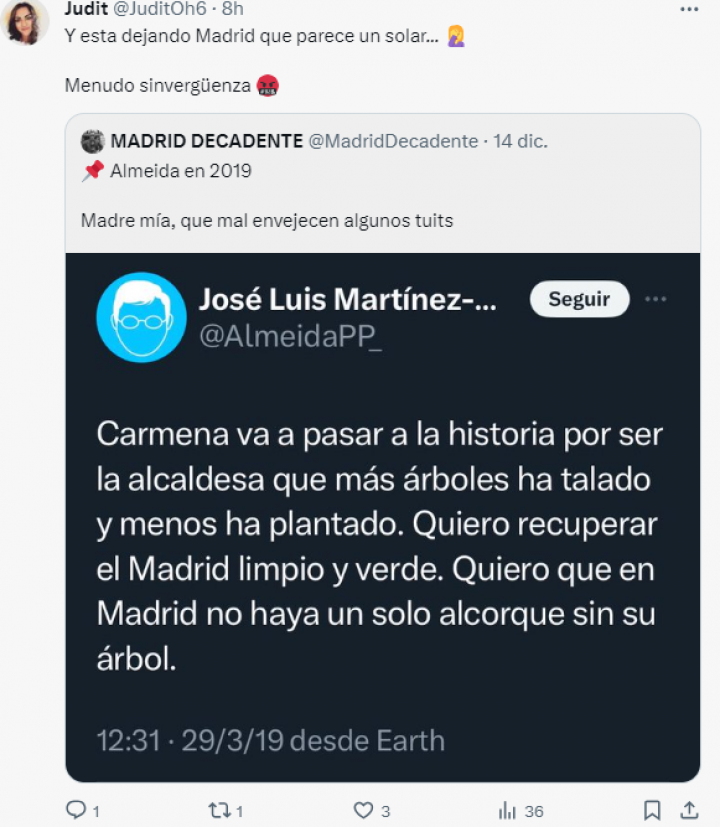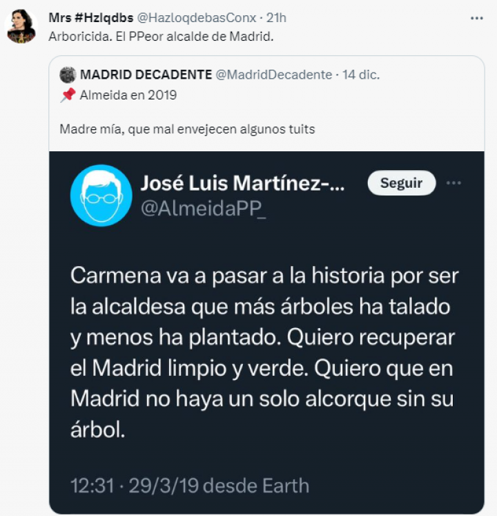 "Carmena va a pasar a la historia por ser la alcaldesa que más árboles ha talado y menos ha plantado. Quiero recuperar el Madrid limpio y verde. Quiero que en Madrid no haya un solo alcorque sin su árbol", escribió entonces Almeida.
