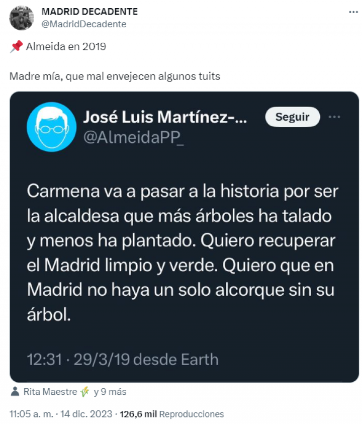 La cuenta de X, antes Twitter, @MadridDecadente ha recuperado el tuit del actual alcalde madrileño, que ha publicado en la red social con las siguientes palabras: "Madre mía, que mal envejecen algunos tuits". La publicación acumula más de 4.000 me gusta.