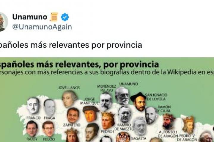 El usuario de X, la red social de Elon Musk anteriormente conocida como Twitter, Unamuno (@UnamunoAgain) ha difundido un mapa que realizó el diario ABC en marzo del 2020 y en el que se muestra, provincia por provincia, quién era la persona más relevante de esa región según las referencias a sus biografías en la Wikipedia.