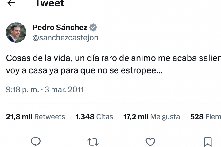 En Twitter han recuperado un tuit de Pedro Sánchez que sirve para definir lo ocurrido en la noche electoral a la perfección. "Cosas de la vida, un día raro de animo me acaba saliendo redondo. Me voy a casa ya para que no se estropee...", dijo Sánchez en 2011.
