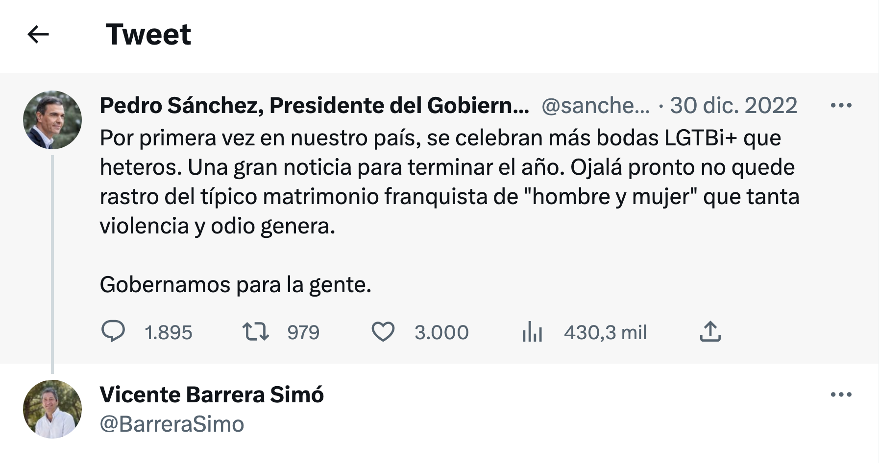 "Por primera vez en nuestro país, se celebran más bodas LGTBi+ que heteros. Una gran noticia para terminar el año. Ojalá pronto no quede rastro del típico matrimonio franquista de "hombre y mujer" que tanta violencia y odio genera. Gobernamos para la gente", decía la cuenta falsa.