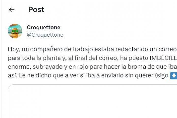 El usuario de Twitter @Croquettone ha publicado un tuit relatando la broma que le ha gastado a su compañero de trabajo después de que este vacilara con insultar al resto de trabajadores en un correo electrónico masivo.