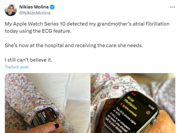 "Mi Apple Watch Serie 10 detectó hoy la fibrilación auricular de mi abuela mediante la función de ECG. Ahora está en el hospital y recibe la atención que necesita. Todavía no lo puedo creer", ha manifestado el tuitero.