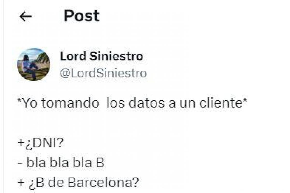 El usuario de X @LordSiniestro ha publicado la tensa conversación que ha tenido con un cliente cuando, al pedirle los datos, le ha consultado la letra del Documento Nacional de Identidad (DNI).