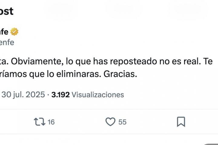 "Obviamente, lo que has reposteado no es real. Te agradeceríamos que lo eliminaras. Gracias", ha ido pidiendo Renfe a todos aquellos que han compartido la imagen manipulada en la red social de Elon Musk.