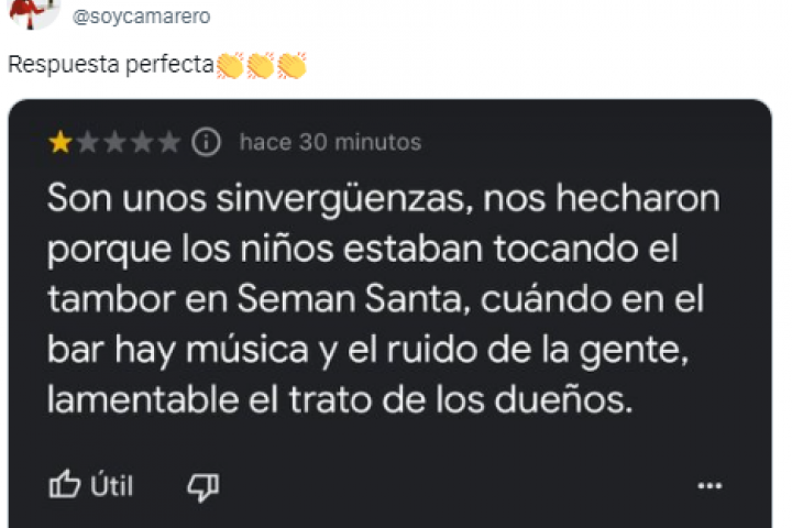 "Son unos sinvergüenzas, nos echaron porque los niños estaban tocando el tambor en Semana Santa, cuando en el bar hay música y el ruido de la gente, lamentable el trato de los dueños", apuntó la persona 'damnificada, que encontró la respuesta de los dueños del local.