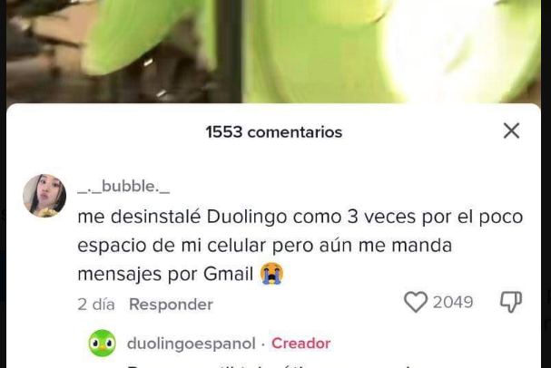 "Me desinstalé Duolingo como tres veces por el poco espacio de mi celular, pero aún me manda mensajes por Gmail", les dijo la seguidora. La réplica de la plataforma es de sobresaliente: "Pero para TikTok sí tienes espacio".