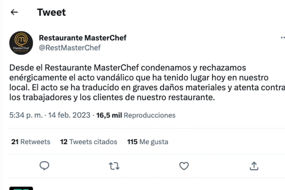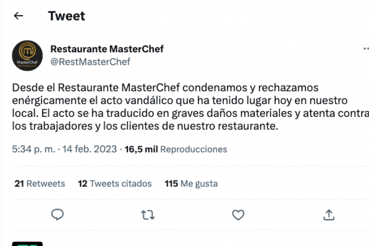 El restaurante de MasterChef, situado en la calle Velázquez de Madrid, ha condenado a través de su cuenta de Twitter un "acto vandálico" que, según han denunciado, se "ha traducido en graves daños materiales y atenta contra los trabajadores y los clientes" del local.