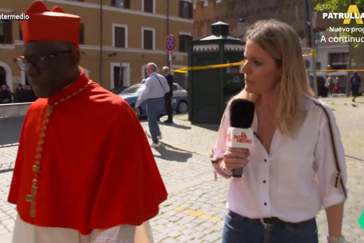 La periodista le pregunta a uno de los favoritos para suceder a Francisco como papa, el guineano Robert Sarah, al que le dice: "Buenos días cardenal, ¿se ve usted como el futuro papa de la iglesia católica? Nada, no tiene ganas de hablar", dice después de preguntarle.