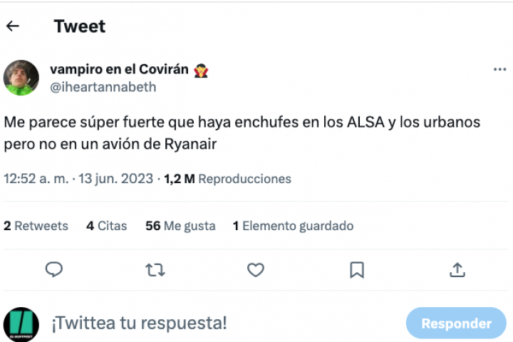 "Me parece súper fuerte que haya enchufes en los ALSA y los urbanos pero no en un avión de Ryanair", ha escrito el tuitero en cuestión, que no hacía refrencia directa (con la arroba) a la aerolínea.