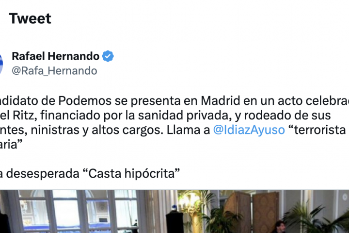 "El candidato de Podemos se presenta en Madrid en un acto celebrado en el hotel Ritz, financiado por la sanidad privada, y rodeado de sus dirigentes, ninistras y altos cargos. Llama a @IdiazAyuso 'terrorista sanitaria'. Son la desesperada “Casta hipócrita', ha escrito el senador del PP.