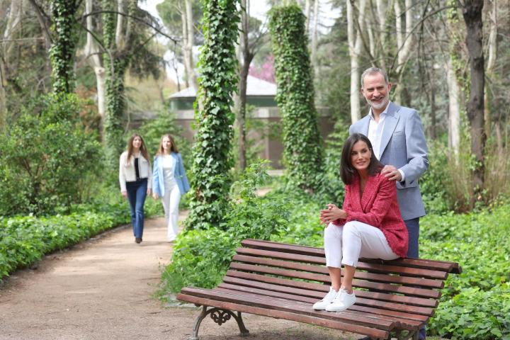 Las fotos de la familia real han sido tomadas en los jardines del Palacio Real y, como señala Europa Press, se ve a los Reyes acompañados de sus dos hijas en actitud cariñosa y de complicidad.