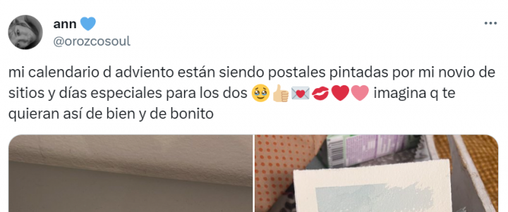 "Mi calendario de adviento están siendo postales pintadas por mi novio", ha explicado en su tweet, que en un día ha acumulado la alta cifra de 27.000 me gusta y mil retuits.