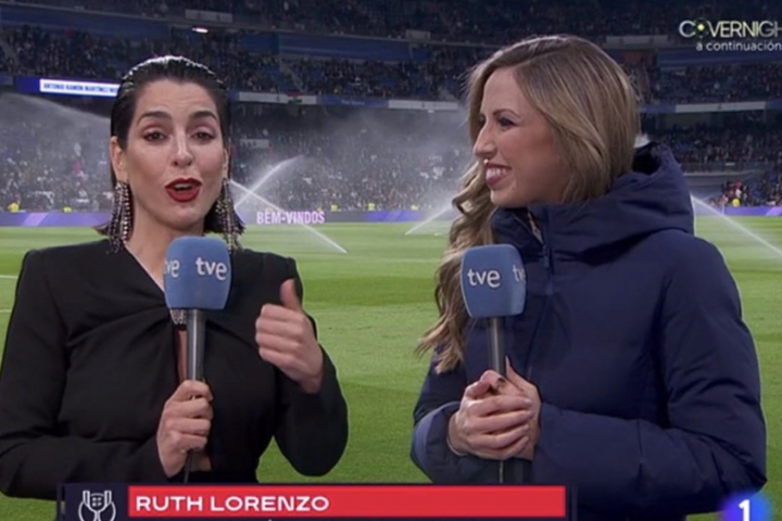 El Real Madrid y el Fútbol Club Barcelona se la juegan este jueves en la ida de las semifinales de la Copa del Rey que desde las 21:00 se juega en TVE. Antes del inicio del encuentro ha estado en el campo la cantante Ruth Lorenzo y le han colocado un rótulo que está dando mucho que hablar.