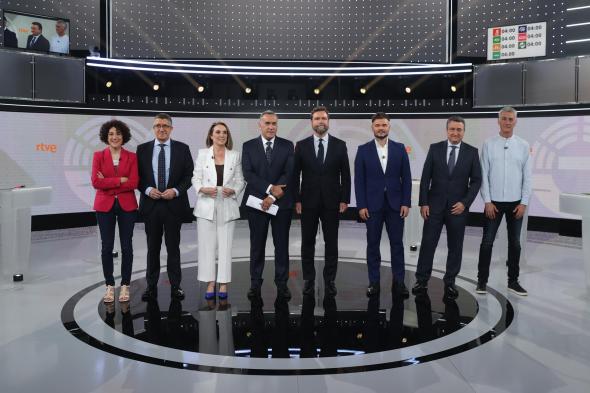 Los siete portavoces parlamentarios protagonizaron este jueves un debate en el que participaron Patxi López (PSOE), Cuca Gamarra (PP), Iván Espinosa de los Monteros (Vox), Aina Vidal (Sumar), Aitor Esteban (PNV), Gabriel Rufián (Esquerra Republicana) y Óscar Matute (EH Bildu).