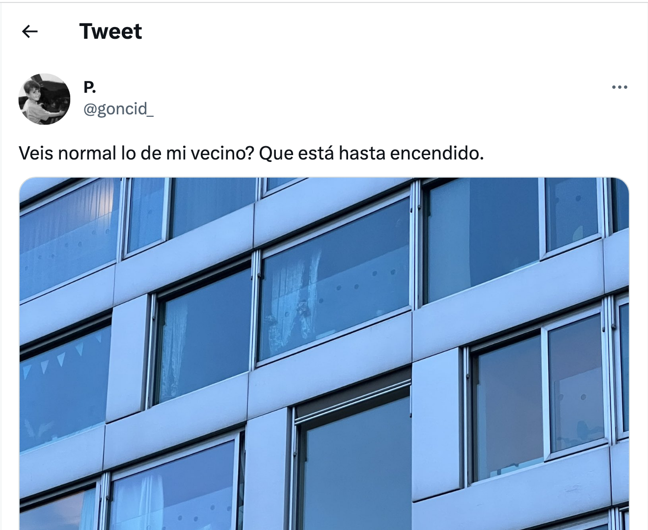 El usuario de Twitter @goncid_ ha dejado a muchos sin palabras al publicar en su perfil una foto de la fachada de su edificio donde, gracias a los grandes ventanales, se puede ver sin problema lo que está haciendo cada vecino.