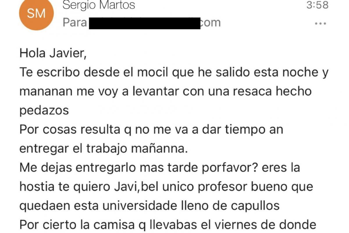 Y prosigue: "Eres la hostia te quiero Javi, el único profesor bueno que queda en esta universidad lleno de capullos. Por cierto, ¿la camisa que llevabas el viernes de dónde es? que está bien guapa que le quiero regalar una a mi padre y seguro que le gusta una así como de viejo molón por favor déjame entregarlo otro día que eres el puto amo y quiero aprobar. Gracias jefe".