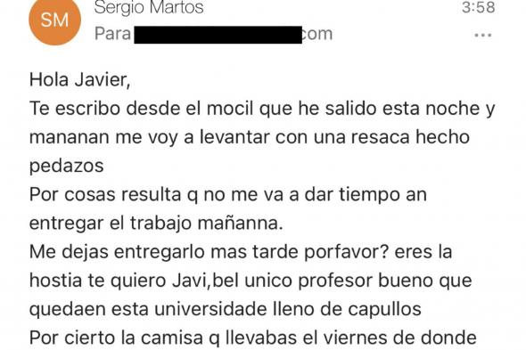 "Hola Javier, te escribo desde el móvil que he salido esta noche y mañana me voy a levantar con una resaca hecho pedazos. Por cosas resulta que no me va a dar tiempo an entregar el trabajo mañana. ¿Me dejas entregarlo más tarde por favor?", dice en el correo con multitud de faltas de ortografía a las cuatro de la mañana.