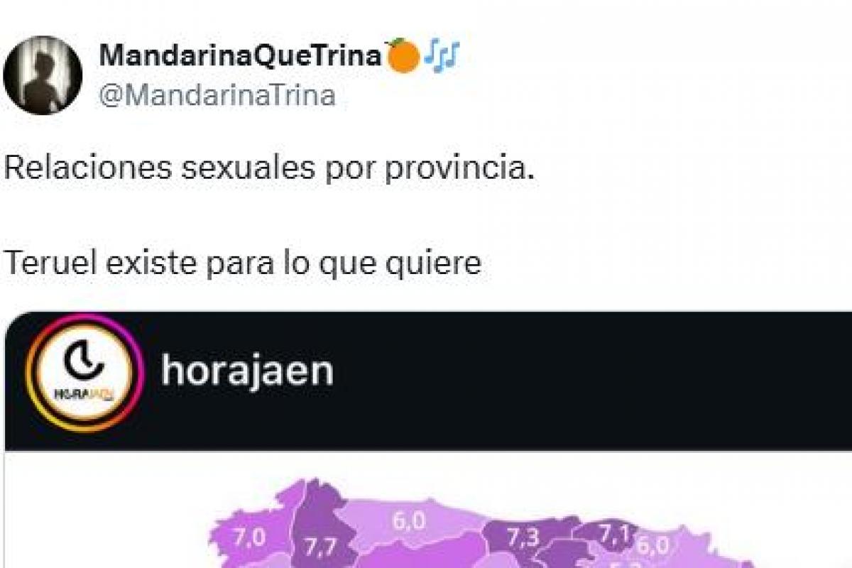 "Relaciones sexuales por provincia. Teruel existe para lo que quiere", ha manifestado la tuitera en tono divertido, consiguiendo con publicación 110.00 visualizaciones, 2.000 'me gustas' y más de un centenar de comentarios.