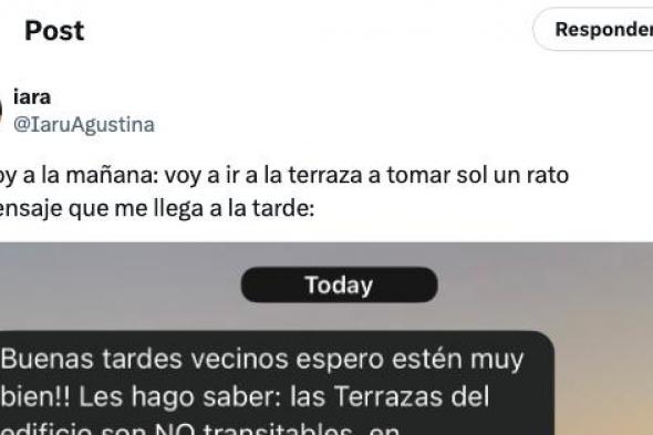 Esta vecina ha compartido con todos en X la reacción de otra usuaria cuando la ha visto tomar el sol. "Yo hoy a la mañana: voy a ir a la terraza a tomar sol un rato. El mensaje que me llega a la tarde", ha dicho con una captura.