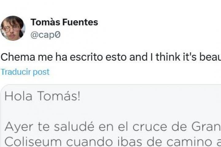 "Ayer te saludé en el cruce de Gran Vía delante del Coliseum cuando ibas de camino a La Ruina y te dije Grande Manel (el apellido Fuentes me jugó una mala pasada). Soy tan idiota que me dijiste Tomás un par de veces y yo entendí 'Tú más' (reaccionando a lo de 'grande'), me lo tuvo que explicar mi mujer segundos después jajajaj", comienza diciendo Chema en el mensaje.