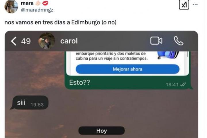 "Nos vamos en tres días a Edimburgo (o no)", ha escrito con ironía la joven, cuyo tuit se ha hecho viral con más de 100.000 reproducciones, 9.000 me gusta y decenas de respuestas de todo tipo.