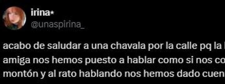 La joven iba caminando por la calle cuando se ha encontrado con una chica a quien confundió con una amiga, pero atención a lo que cuenta después. "Acabo de saludar a una chavala por la calle porque la he confundido con una amiga, nos hemos puesto a hablar como si nos conociésemos de hace un montón", relata en un tuit.