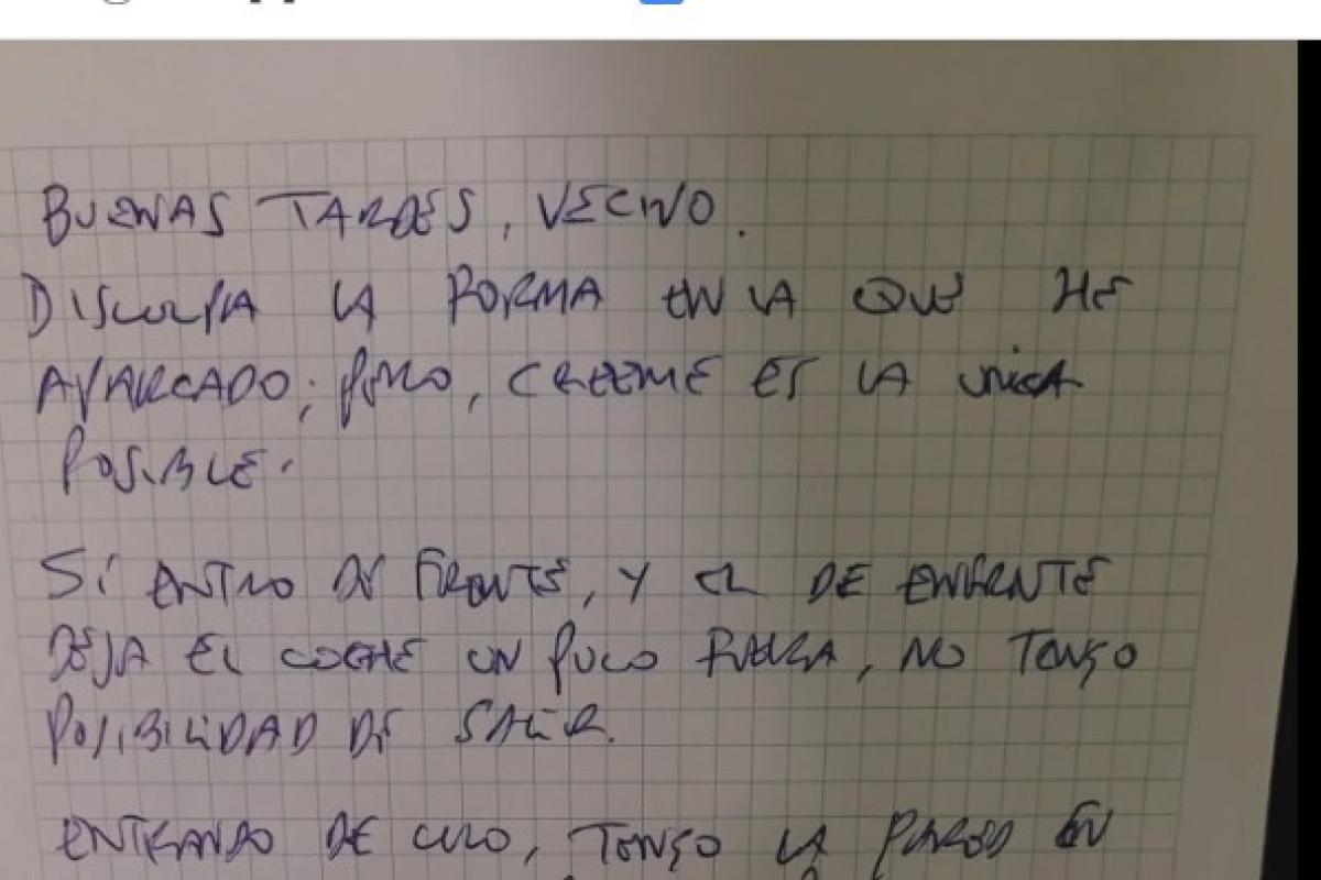 En el escrito se puede leer: "Buenas tardes, vecino. Disculpa la forma en que he aparcado, pero, créeme, es la única posible. Si entro de frente, y el de enfrente deja el coche un poco fuera, no tengo posibilidad de salir".