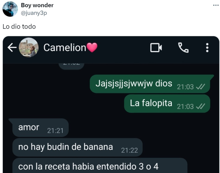 "Amor, no hay budin de banana", se puede ver como inicia la novia la conversación, para proseguir contándole cuál es la razón por la que no ha conseguido elaborar la receta que tenía en mente.
